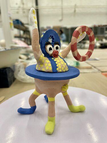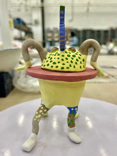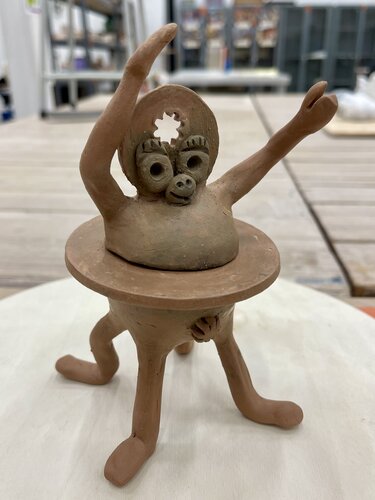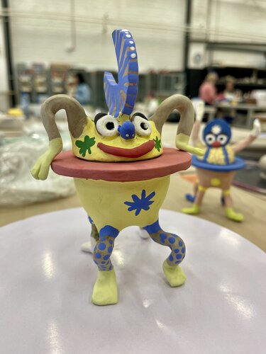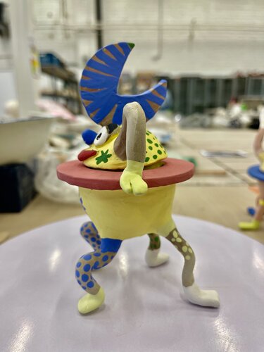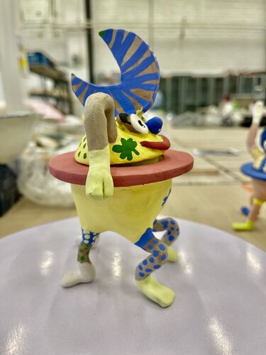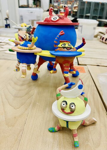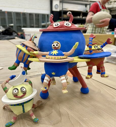 Kleurrijk en speels… de moedersatteliet en haar kleine satellieten dansen in het universum, onderweg dragen ze een eitje, als poubelle de table, voor diphapjes en meer. (Functioneel: allemaal potjes met voetjes en dekseltjes) (sculpturaal: kleurrijke sattelietjes)