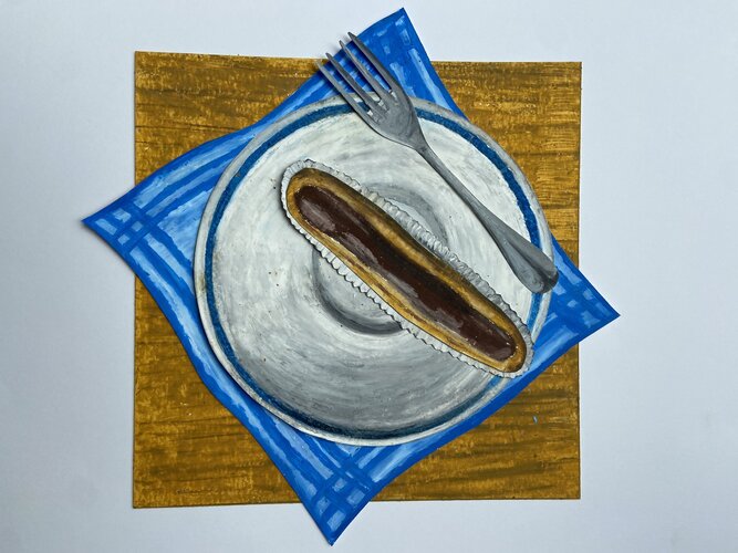 Een éclair op een zaterdagnamiddag om 14:30. Het eerste werk van een nieuwe reeks koffiekletsen.