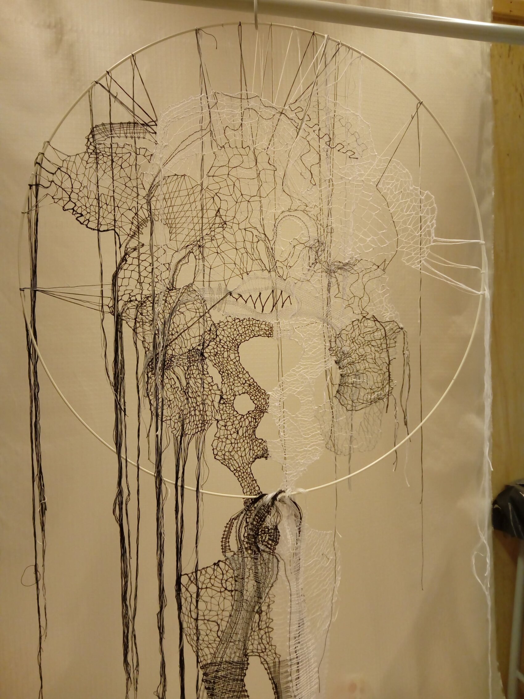 Het werk is in witte en zwarte draad gekantklost en bevindt zich in een cirkel.