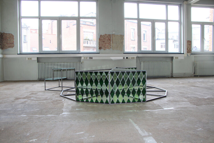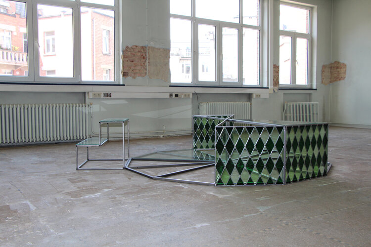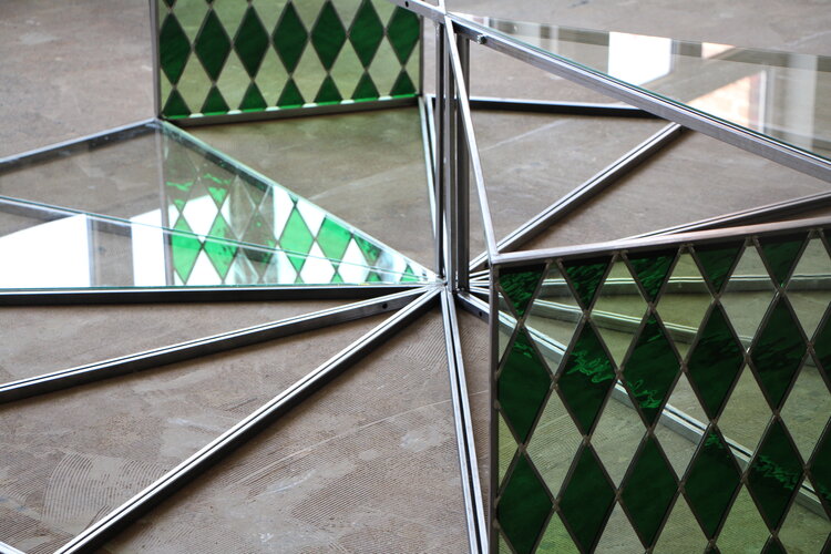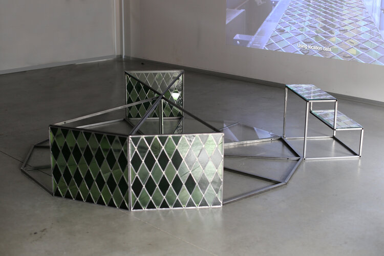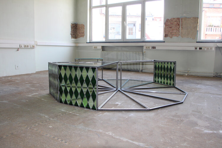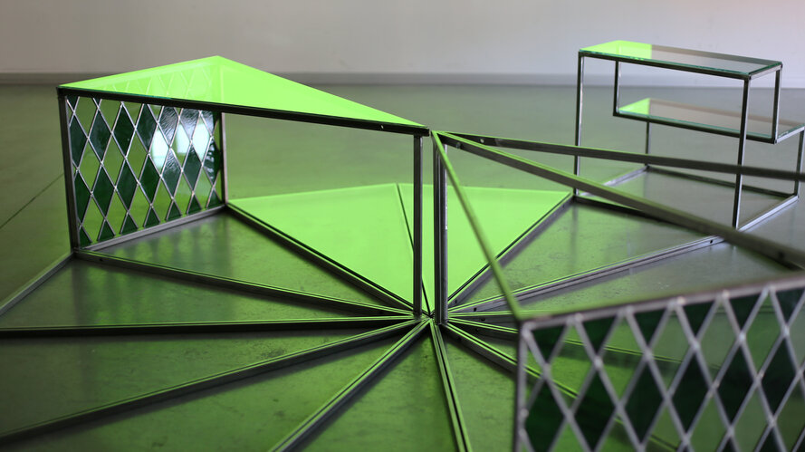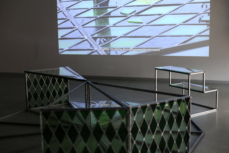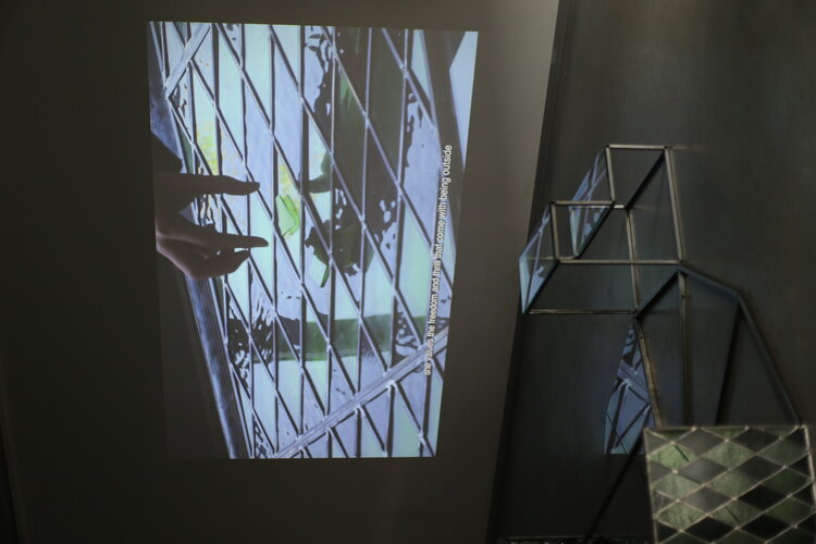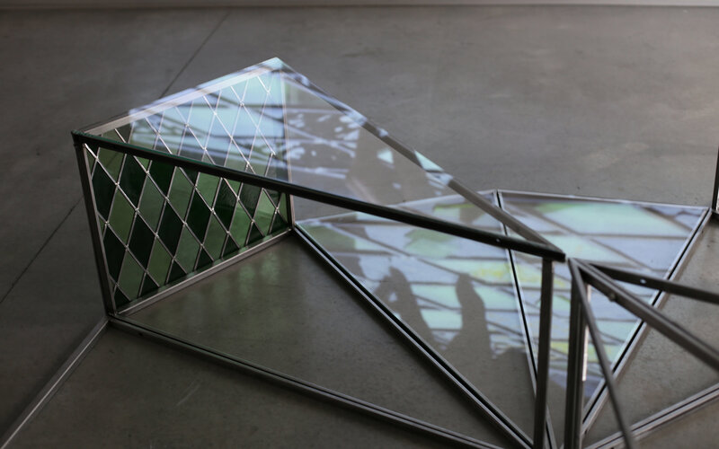 In a video, an artificial voice describes the generated personality, while Sweetlove plays an unspoken game against herself. She switches roles, as both protagonist and antagonist, at a kind of checkboard, where she slides pieces of glass across a larger stained-glass window in light-and dark green. The act is one of introspection: she analyzes her own steps, choices, and doubts.