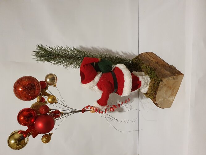 De kerstman verwijst naar de culturele tradities rondom de kerst en roept gevoelens van vreugde en kinderlijke verwondering op, terwijl de ballon een speelse, feestelijke sfeer toevoegt. Visueel gezien kan de assemblage aantrekkelijk zijn door de heldere kleuren en interessante contrasten.