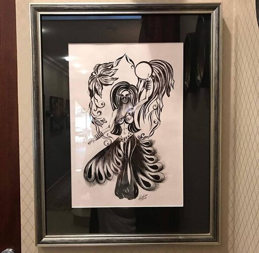 De tekening toont een vrouwelijke danseres gevangen in een moment van ritmische beweging en innerlijke kracht. Met vloeiende lijnen en sierlijke vormen vangt de kunstenaar het gevoel van vrijheid en energie dat uit dans voortkomt.