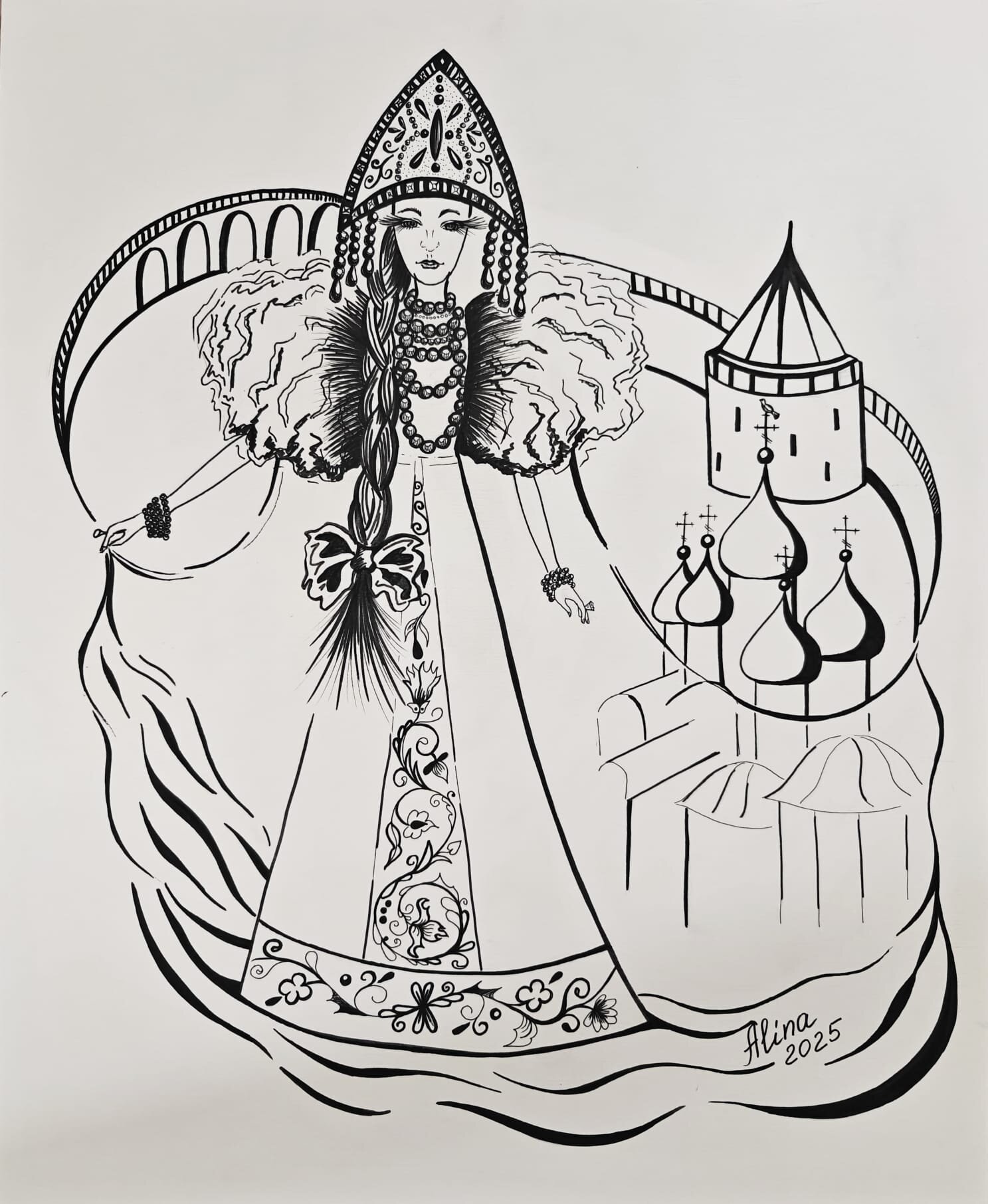 Haar kleding is rijk versierd met ornamenten die typerend zijn voor de oude Russische decoratieve kunst, en haar kokoshnik-hoofdbedekking geeft haar een uitstraling van waardigheid en culturele identiteit.