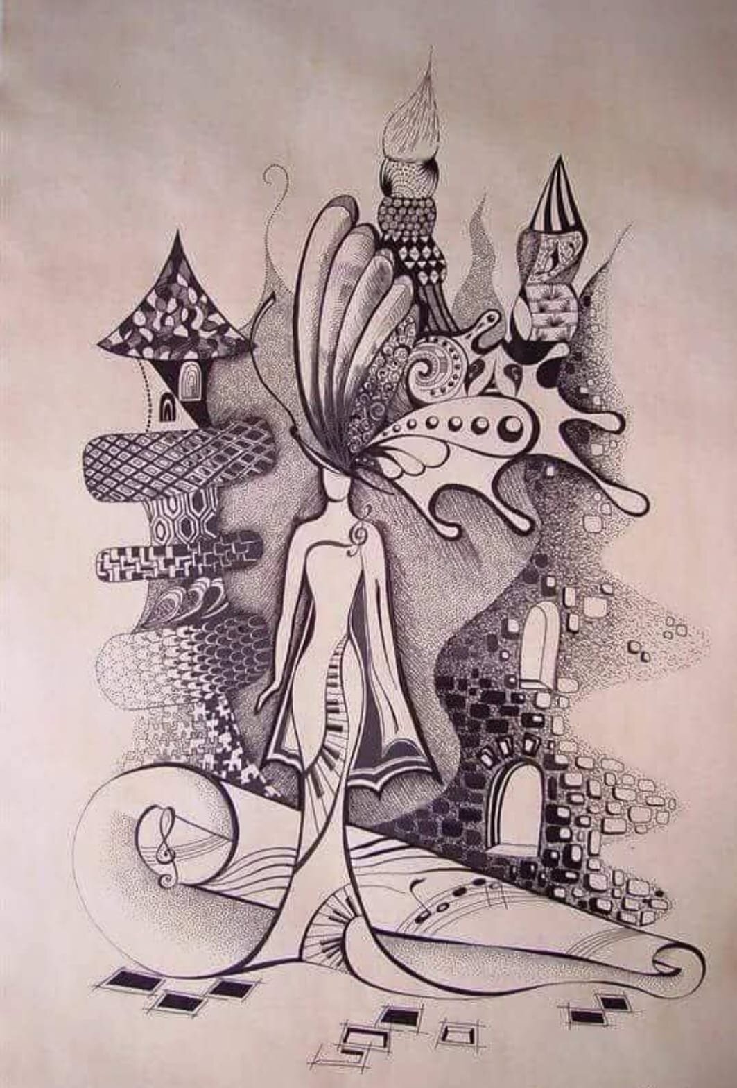 In plaats van een hoofd heeft ze gigantische, complexe vleugels, die lijken op vlindervleugels. De vleugels hebben meerlaagse patronen, waaronder spiralen, stippen, strepen en abstracte vormen – als een mix van natuur, architectuur en de chemie van het leven.