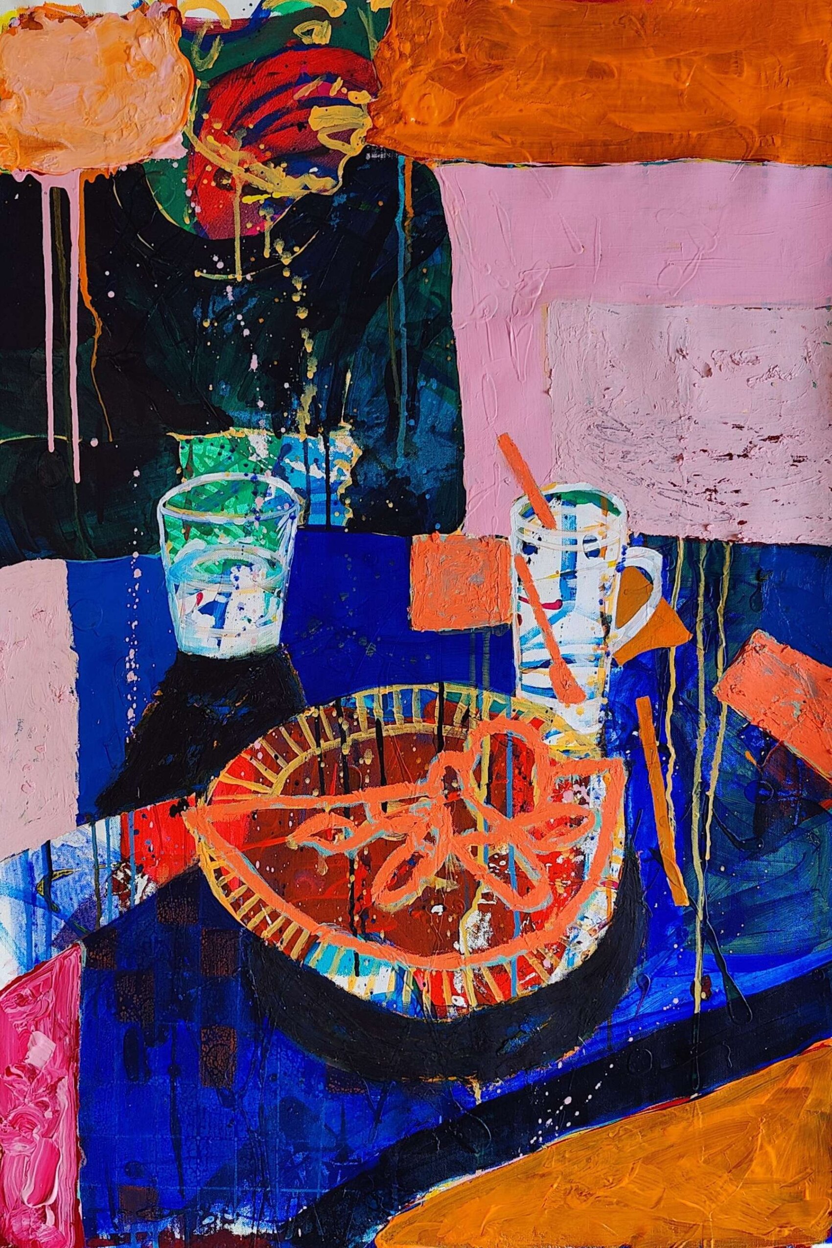 In dit beeld staat één figuur samen met de tafelschikking centraal. Door het spel van het oranje kleurgebruik boven- en onderaan het werk, wordt de figuur en tafel vastgezet op het doek. Er ontstaat een spel tussen dekkende en doorlatende verfvlakken die met acrylverf en oliesticks gecreëerd worden.