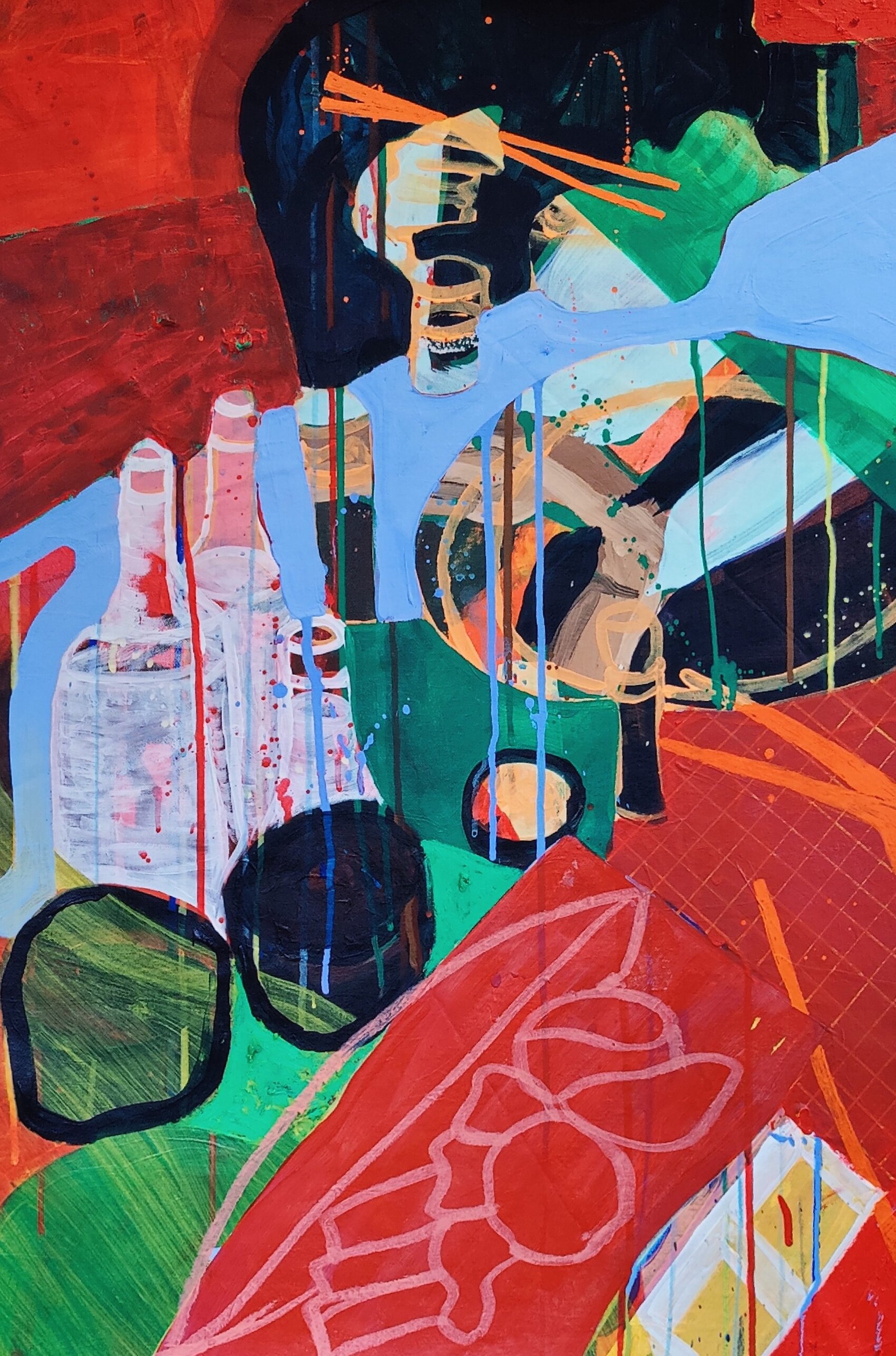 Er ontstaat een spel tussen dekkende en doorlatende verfvlakken die met acrylverf en oliesticks gecreëerd worden.