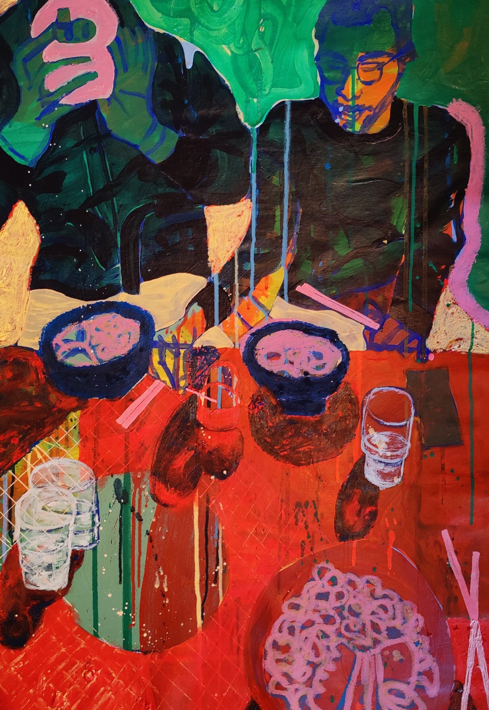 Het beeld omvat twee figuren met een tafelschikking. Het felle kleurgebruik creëert een opgewekte sfeer.