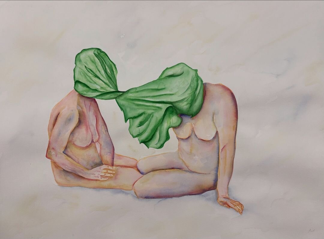 Tussen Adem en Aanraking — twee lichamen, één levensadem. Intimiteit die voedt en tegelijk beklemt. Gezichten lossen op in een groene sluier — een gedeelde levensadem tussen ons. Nabijheid die voedt en toch zachtjes beklemt. Waar eindigt ‘wij’ en begint ‘ik’?