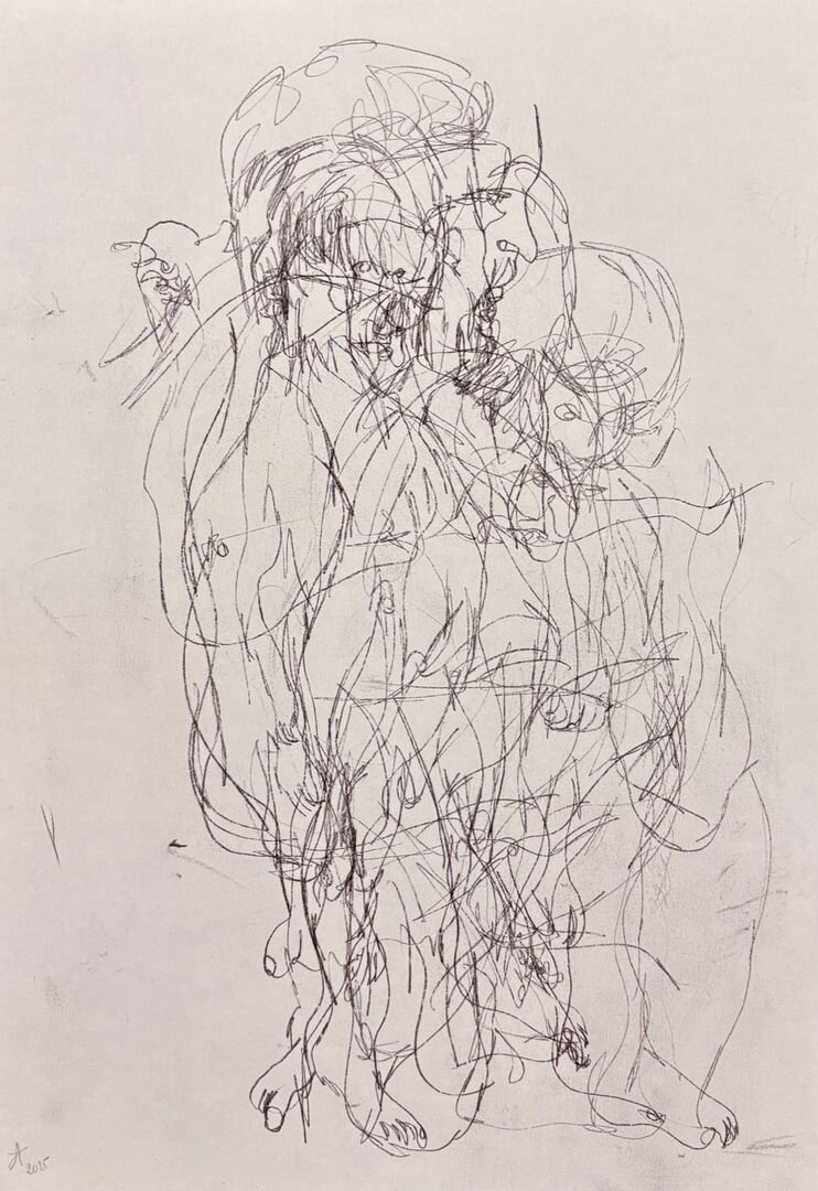 Een stille, meerstemmige figuur, gevormd door elkaar kruisende lijnen. Profielen overlappen, randen verzachten en het wit van het papier wordt onderdeel van het lichaam. Van dichtbij leiden subtiel aangezette druk en snelheid de blik; vanop afstand verschijnt een samenhangende silhouet. De tekening balanceert tederheid en terughoudendheid, en toont hoe samenhang kan ontstaan zonder eenvormigheid. Een contemplatief werk op papier met een sterke aanwezigheid aan de muur.
