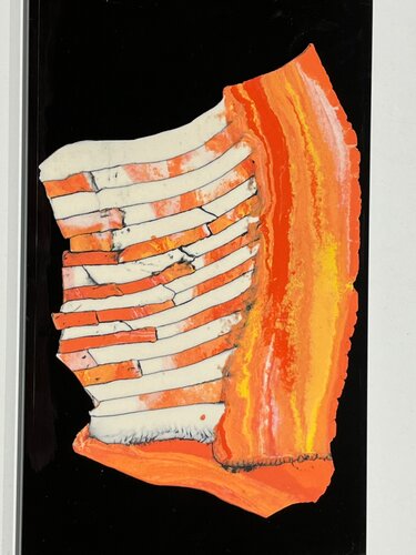 De kracht van de oranje gloed: in de massa ingekleurde papierporselein, deels in een gemarmerd patroon en deels in repen gesneden om vervolgens terug samen te voegen en uit te rollen in een vlakke abstracte vorm. Ongeglazuurd afgewerkt en gestookt op 1240 gr.