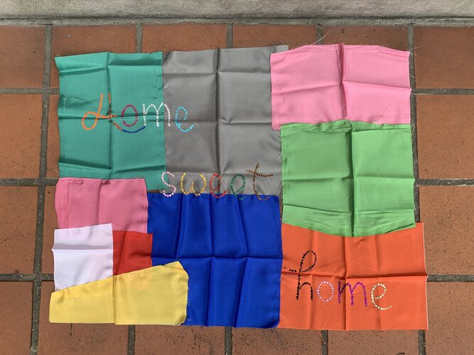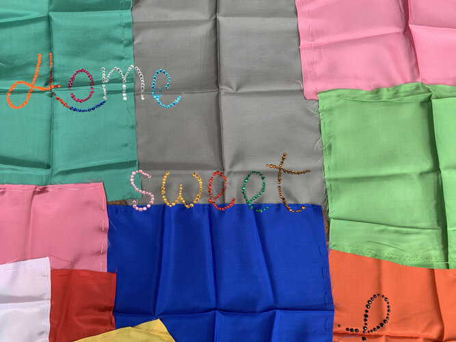 Een vloermat waarop je je voeten niet kunt vegen. Een home sweet home dat blinkt van kunstzijde, plastic glans en goedkope charme. Met lapjes reststof, draadjes en kraaltjes ontstaat een werk dat balanceert tussen zorg en absurditeit.