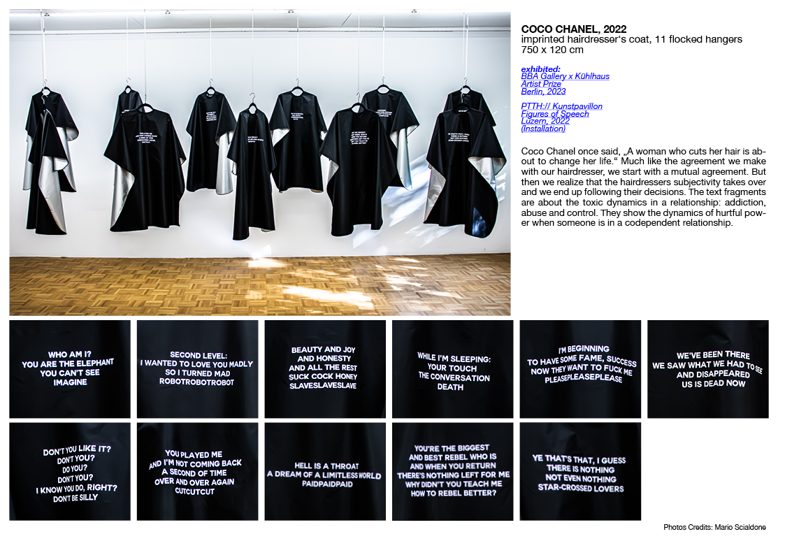 Coco Chanel once said, „A woman who cuts her hair is about to change her life.“ Much like the agreement we make with our hairdresser, we start with a mutual agreement. But then we realize that the hairdresser‘s subjectivity takes over and we end up making their decisions. The text fragments are about the toxic dynamics in a relationship: addiction, abuse and control. They show the dynamics of hurtful power when someone is in a codependent relationship.
