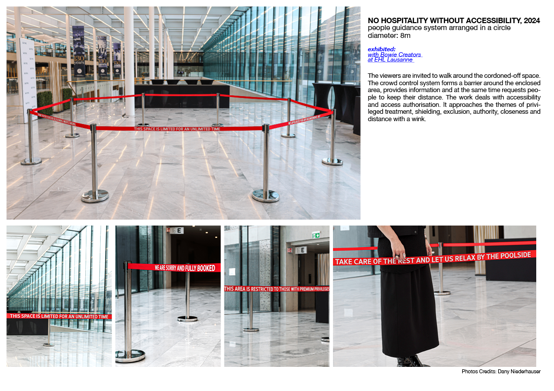 The viewers are invited to walk around the cordoned-off space. The crowd control system forms a barrier around the enclosed area, provides information and at the same time requests people to keep their distance. The work deals with accessibility and access authorisation. It approaches the themes of privileged treatment, shielding, exclusion, authority, closeness and distance with a wink.