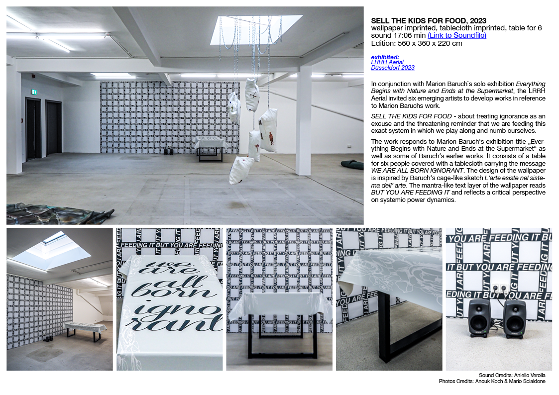 The work responds to Marion Baruch‘s exhibition title „Everything Begins with Nature and Ends at the Supermarket“ as well as some of Baruch‘s earlier works. It consists of a table for six people covered with a tablecloth carrying the message WE ARE ALL BORN IGNORANT. The design of the wallpaper is inspired by Baruch‘s cage-like sketch L‘arte esiste nel sistema dell‘ arte. The mantra-like text layer of the wallpaper reads BUT