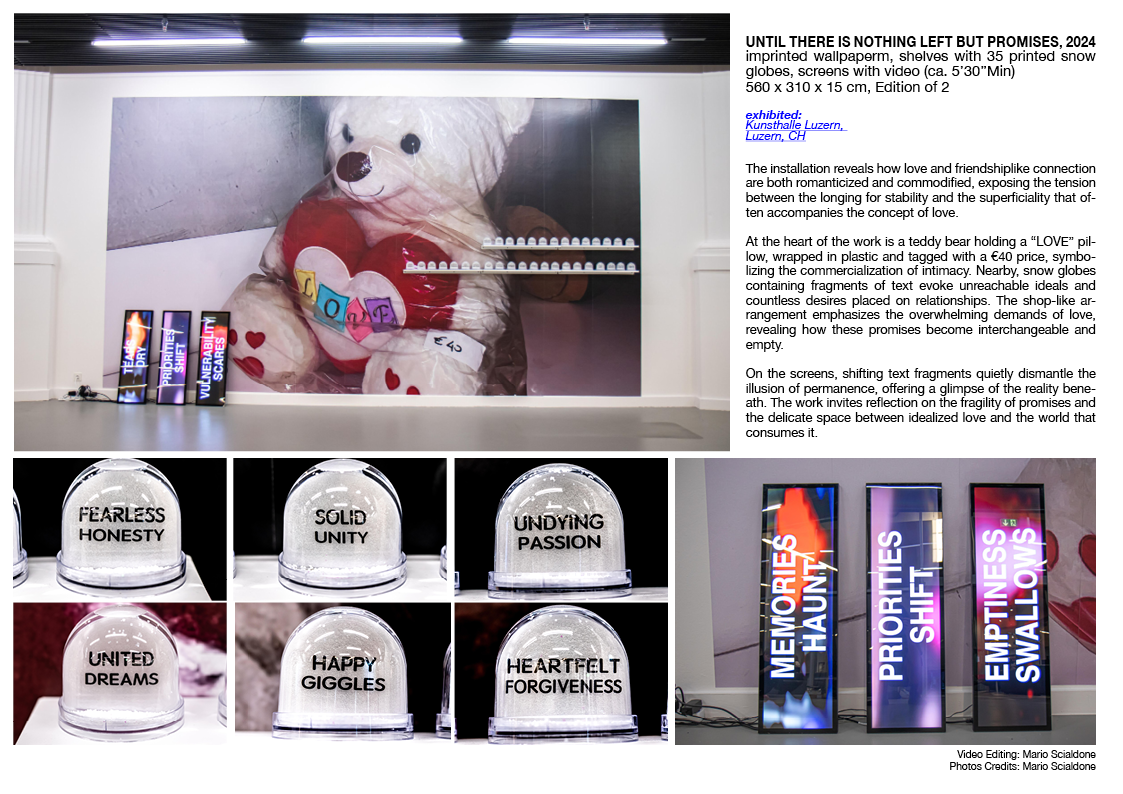 At the heart of the work is a teddy bear holding a “LOVE” pillow, wrapped in plastic and tagged with a €40 price, symbolizing the commercialization of intimacy. Nearby, snow globes containing fragments of text evoke unreachable ideals and countless desires placed on relationships. The shop-like arrangement emphasizes the overwhelming demands of love, revealing how these promises become interchangeable and empty.
