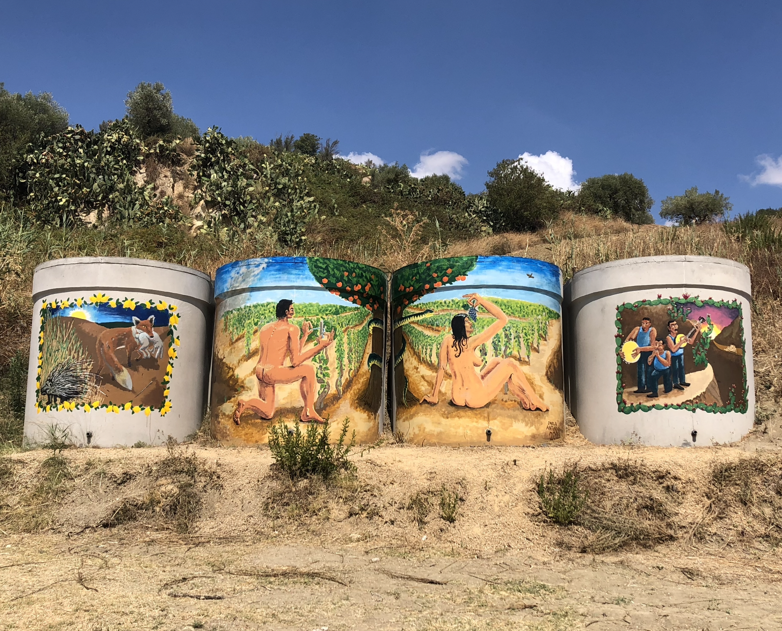 Een vierdelige muurschildering op 4 watersilo’s (lak op beton, 250 x 1000 cm) in opdracht van wijnproducent Filippo Rizzo te San Michele di Ganzaria, het Siciliaanse dorp van oorsprong van mijn vader. Deze maakte ik in samenwerking met Emiel Vandekerckhove en is gebaseerd op de locale fauna en flora, wijncultuur en mythologie.