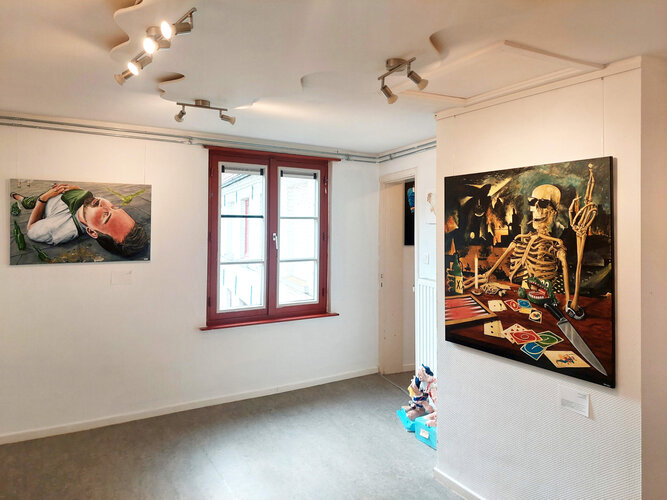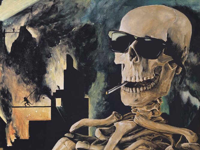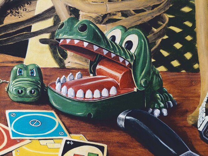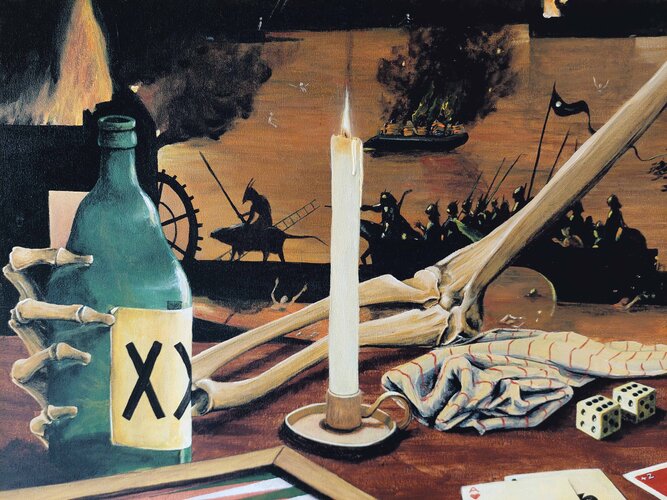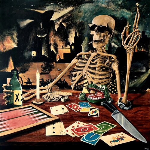 De achtergrond is gebaseerd op een fragment van het ‘Hel’-paneel van ‘De Tuin der Lusten’ (ca. 1503) van Jheronimus Bosch. Bosch’ brandende zeilboot is vervangen door Banksy’s opblaasbare reddingsboot, zoals te zien op Glastonbury (2024). De sigaret is geïnspireerd op ‘Kop van een skelet met brandende sigaret’ (vermoedelijk 1886) van Vincent van Gogh. Backgammon-verwijzing naar ‘De kaartspelers’ (1595/96) van Michelangelo Merisi da Caravaggio.