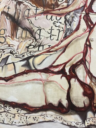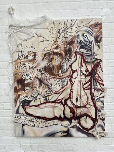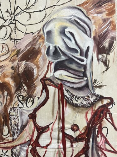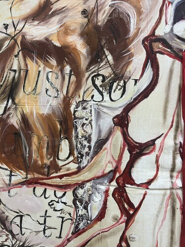 Olieverf schilderij op bewerkte gordijnstof met aan de rechterkant een naaktfiguur met stof over het gezicht. De figuur is uitgelijnd in het rood, specifieker nageschilderde open wondes. Op de achtergrond is er een haarachtig bruin getint stuk dat van de linker onderhoek naar de rechter bovenhoek gaat tekst is leesbaar doorheen dit stuk. Onderaan waar de figuur op zit is een stuk geschilderd stof met een kanten boordje. Dit kanten boordje komt terug buiten het kader her en der met echte kant. De linker bovenhoek heeft een uitsteeksel van verhard stof.