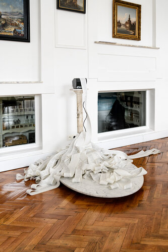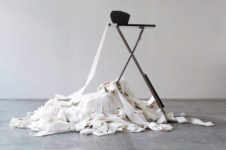 Deze installatie ontstond uit een samenwerking met Ana Van Liedekerke. Een kassaprinter spuugt onafgebroken manifesten uit — teksten die gegenereerd werden door een artificiële intelligentie op basis van de prompt: