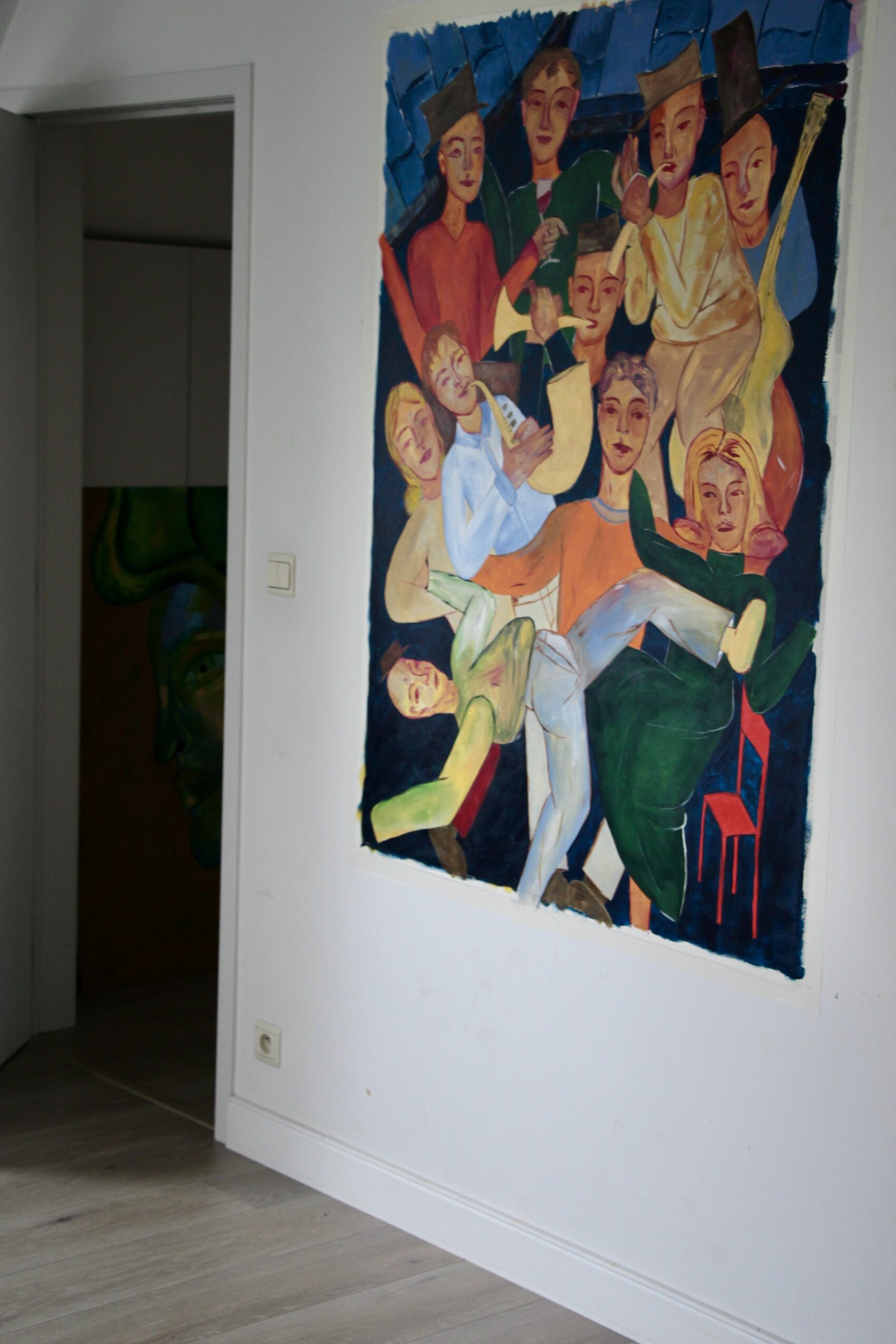 Voor het werk Streetfest, wou ik de emoties in beeld brengen die in mij opkomen bij het luisteren van Jazz muziek - de samenhorigheid en intimiteit die muziek teweeg brengt. Het tafereel vindt plaats op straat, een plek van anonimiteit.