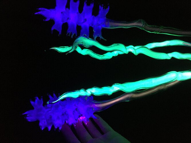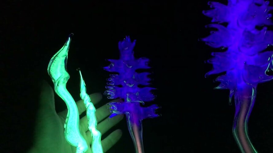 The sculptural medium of plasma art - blown glass filled with noble gases - creatively combines art, science and technology. These flowers are made from flameworked borosilicate glass, filled with a low pressure of krypton gas, and illuminated by a high voltage, high frequency electronic power supply. The krypton gas creates a glowing white plasma light, and a coating of phosphor inside the blown glass provides a brilliant purple color.