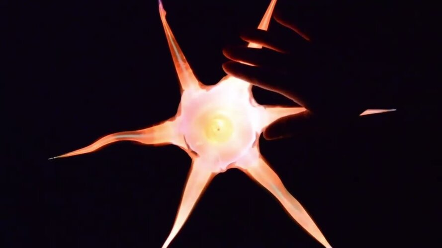 Drawings of stars appear throughout the Voynich Manuscript. There are over 300 drawings of figures who hold stars in the so-called "zodiac" section, and I find these images particularly compelling. Without being able to read the text, one can only speculate about what this recurring motif may mean. The stars we see in the night sky are made of plasma, but many light-years away and impossible to ever touch. So I created a touch-interactive star sculpture using the medium of plasma art - blown glass filled with noble gases. This sculpture is made from flameworked borosilicate glass, filled with a low pressure of krypton gas, and illuminated by a high voltage, high frequency electronic power supply.