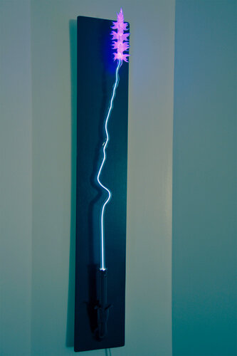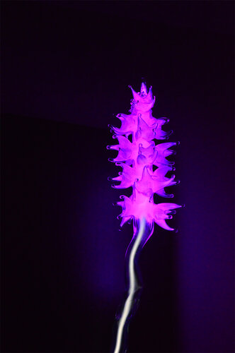 The medium of plasma art is a fusion of art, science and technology. Blown glass is filled with noble gases and energized by a high-voltage power supply, producing plasma light that glows, moves and interacts with touch.