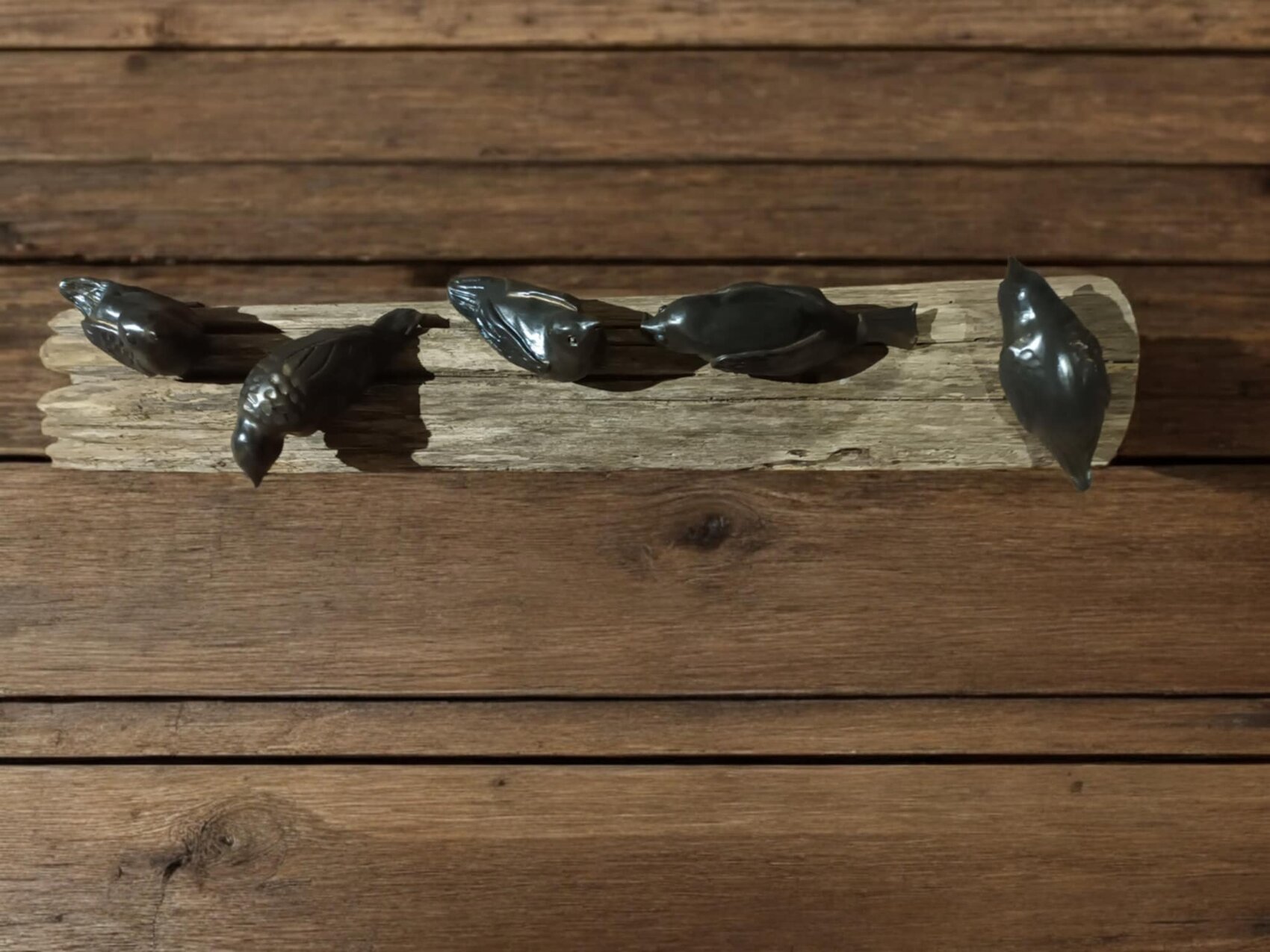 deze keramische vogels hebben een warm bronzen tint , geplaatst op een houten stronk die vlak is onderaan , waardoor deze gemakkelijk als decoratief stuk in het interieur kan geplaatst worden maar ook buiten komt deze zeker tot zijn recht