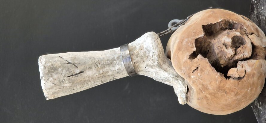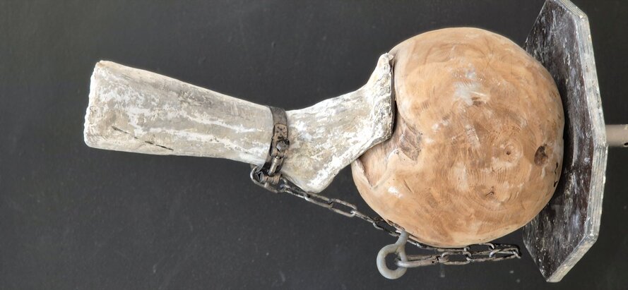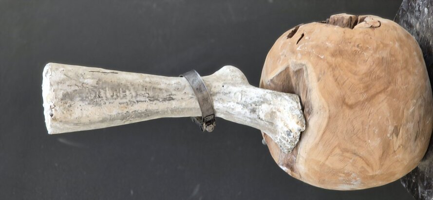 Bot, hout en ketting houden een fragiele stilte vast, gevormd door de constante poging om geaard te blijven terwijl de wereld steeds zwaarder wordt.