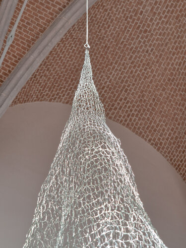Deze textielinstallatie werd gerealiseerd voor de tentoonstelling “Kunst in het dorp 2025” en werd opgesteld in de O.-L.-Vrouw kerk te Bellingen. De installatie zelf neemt het kerkkoor als vertrekpunt en werd van hieruit verder ontwikkeld. Bovenaan ontstaat een textielverbinding die zich uitsterkt en verder ontplooit naar beneden toe. De fijne metaaldraden zweven als het ware in het ijle. De verticaliteit van de ruimte en ‘het rijken naar de hemel’ worden hierdoor verder benadrukt. Het zonlicht dat via de glas-in-loodramen binnenvalt wordt versterkt en verder gereflecteerd in de omliggende ruimte. De interactie tussen object en omgeving draagt bij aan de sacrale sfeer en versterkt deze. Licht en luchtigheid staan centraal.