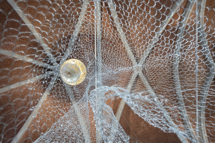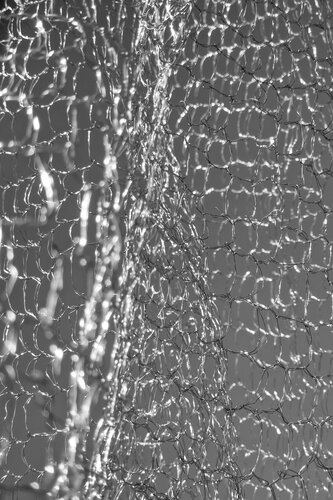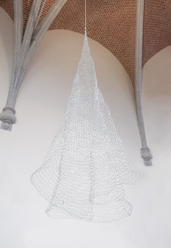 Het project vertrok vanuit een onderzoek naar textiel, de verschillende technieken & patronen die hierin worden toegepast en het experimenteren met andere, niet-gebruikelijke materialen. Ieder materiaal wordt gekenmerkt door zijn typerende eigenschappen zijnde: dikte, sterkte, draagkracht, soepelheid, elasticiteit, etc. De fijne metaaldraad in deze installatie kenmerkt zich door zijn sterkte en onrekbaarheid, maar blijft tegelijkertijd ook soepel. Enerzijds maakt dit het materiaal toegankelijk om verschillende textielverbindingen mee uit te werken, anderzijds zorgt de onrekbaarheid voor grote, blijvende openingen tussen de verbindingen onderling. Dit draagt op zijn beurt bij aan de luchtigheid en transparantie van het geheel. Er ontstaat een organische vorm die bepaald wordt door de sterkte van het materiaal in combinatie met de toegepaste techniek, maar die tevens onderhevig is aan de zwaartekracht. Plooien ontvouwen zich en vallen naar beneden. De beweging in dit werk is typerend. Het geheel gedraagt zich als een textiel, maar dan ook weer niet. Een traditionele techniek wordt verder gezet en overgebracht op een niet-conventioneel materiaal met zijn bijhorende eigenschappen. Zijn tactiliteit is eigen en uniek.