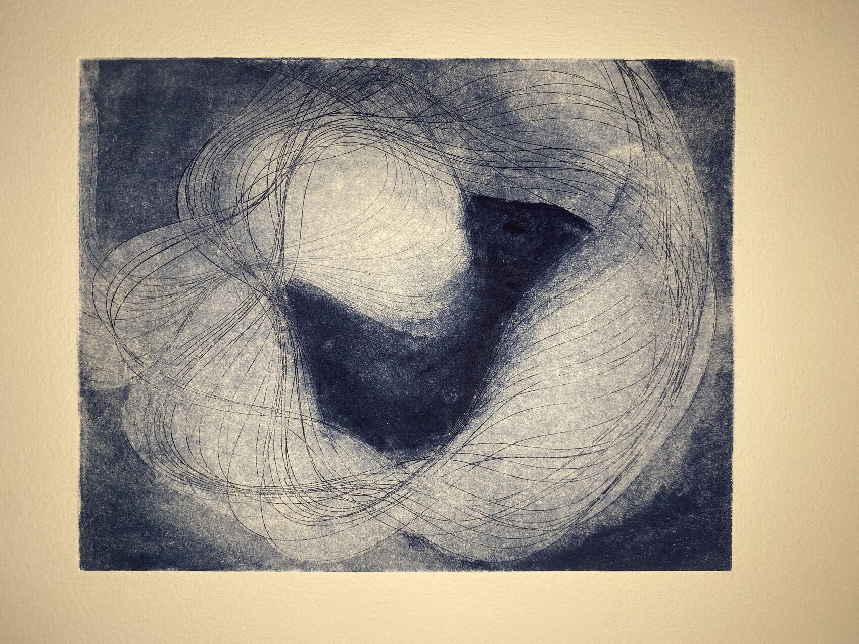 De beweging van een Orka die afdaalt naar de diepte. De verschillende blauwe tinten symboliseren zowel de rust als de geheimzinnigheid van de onderwaterwereld. Het werk verbeeldt de overgang van licht naar donker, van oppervlakte naar diepte — een moment van overgave aan het onbekende.