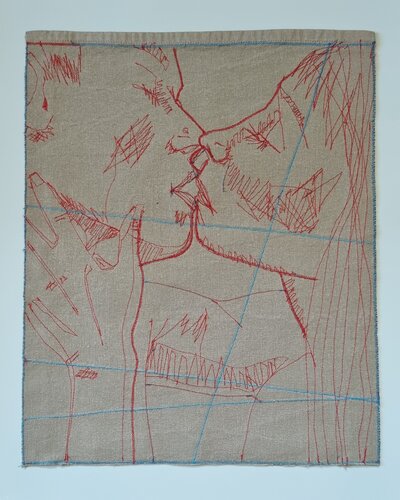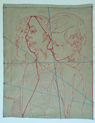 Het werk is gemaakt uit vier geweven zachtgroene katoenen doeken, die als onderlegger hebben gediend. Op elk doek is een koppel te zien in een intieme, liefdevolle houding. De beelden zijn ontstaan door met de vrije hand te stikken op de machine. De draad krijgt de rol van potlood en het doek wordt een soort papier.