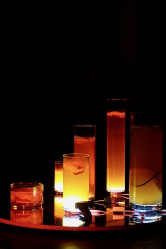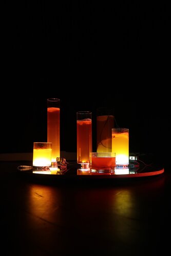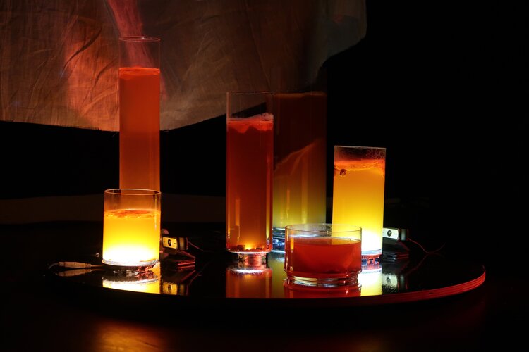 Glass vessels hold active kombucha, each rising bubble captured by a camera and transformed into sound in real time.