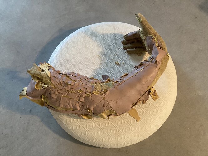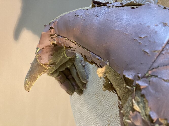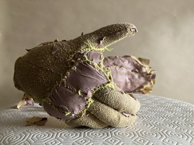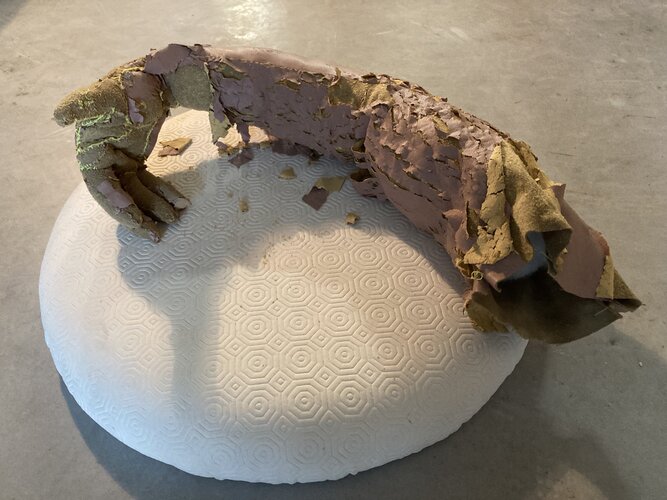 De textiele huid van de arm schilfert af, alsof het lichaam zelf het proces van vervelling ondergaat. De schilfers, zorgvuldig behouden, maken deel uit van het wezen van het werk. Ze vertellen over de sporen van het verleden, over littekens die niet verdwijnen maar transformeren.