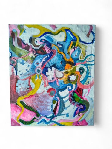 Het rode hoofd in het midden is toevallig ontstaan toen de rode ecoline aan het drogen was. Het doek is niet helemaal strak opgespannen en de inkt vloeide naar het midden van het vlak. Het heeft 4 dagen geduurd eer de vlek droog was. Plots zag ik een gezicht. Enkel de high-lights heb ik een beetje verduidelijkt en that’s it. De schaduwpartijen waren al aanwezig. Hij of zij wordt omringd door vlekken waarbij mijn fantasie weer vrij spel heeft gekregen.
