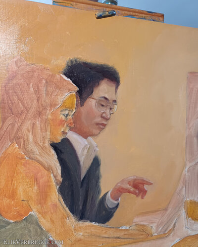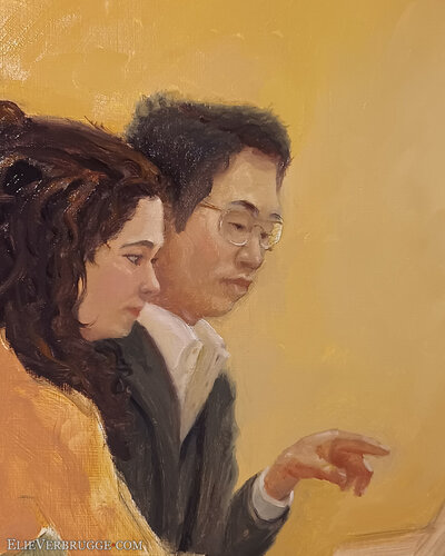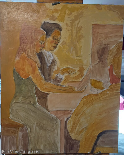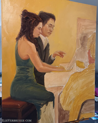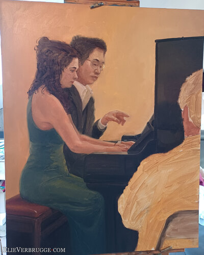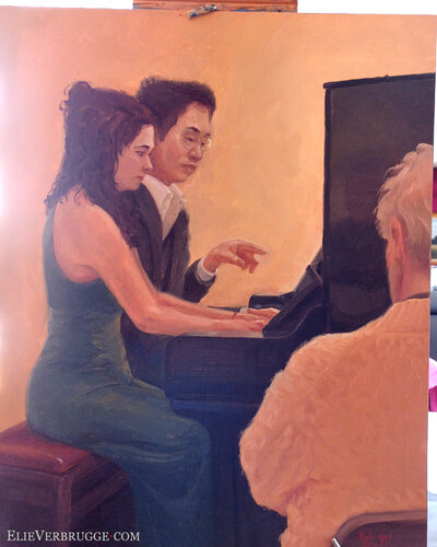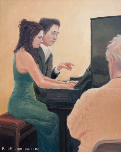 Ze spelen à quatre mains. Met vier handen op een piano dus. Daarvoor moeten ze heel goed naar elkaar luisteren, reactief spelen en wordt elk akkoord een conversatie. Het is een mooi samenspel om te aanschouwen.