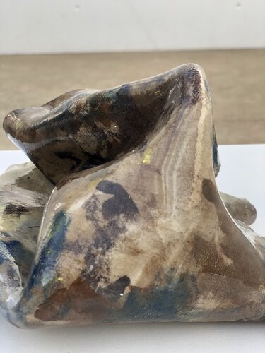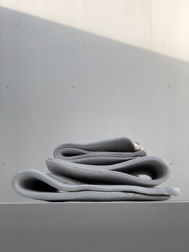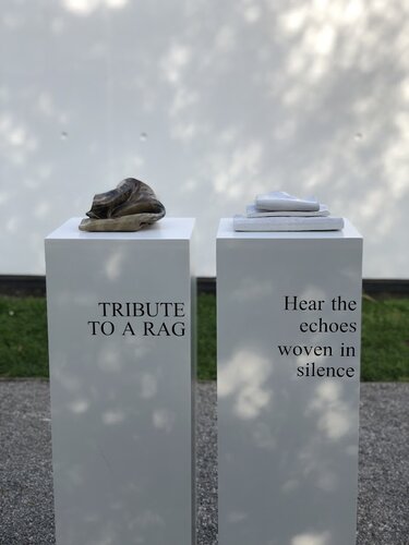Twee keramische sculpturen, ogenschijnlijk eenvoudige vodden, liggen op sokkels als stille restanten van textiel. Maar wie beter kijkt, ziet dat ze hard, breekbaar, glanzend en met uiterste zorg zijn vervaardigd. Op de ene sokkel liggen witte, ongebruikte en netjes opgeplooide doeken; op de andere een kleurrijke, doorleefde lap, doordrenkt met sporen van artistieke arbeid. Tussen beide ontstaat een spanningsveld van betekenis, nut, herinnering en verlies.