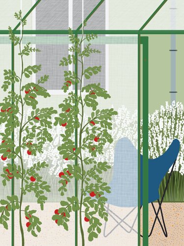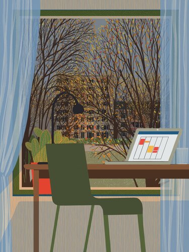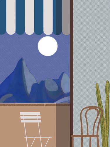 Het blauwe licht op de eerste verdieping van een vakantiewoning, waar stoelen allerlei samen staan. - De luie stoel dicht bij het grote huis waarvan de leefruimte zich een meter hoger bevindt. - Het schreeuwerige licht van de kalender dat in schril contrast staat met de warme gloed in de kamer.