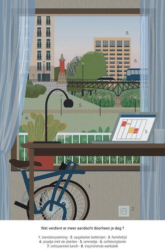 1. bandenspanning - 2. opgeladen batterijen - 3. familietijd - 4. praatje met de planten - 5. ommetje - 6. ochtendgloren - 7. ontspannen lunch en - 8. inspirerende werkplek