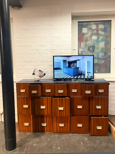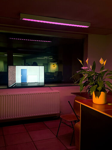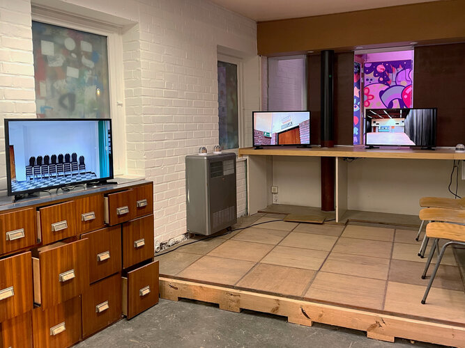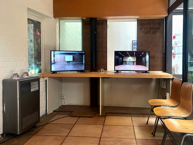 Site-specific installation, originally created for the U-shaped meeting room at KASK School of Arts and later reworked for The Giftshop in Ghent. The work is composed of objects found on site and a four-channel video installation.