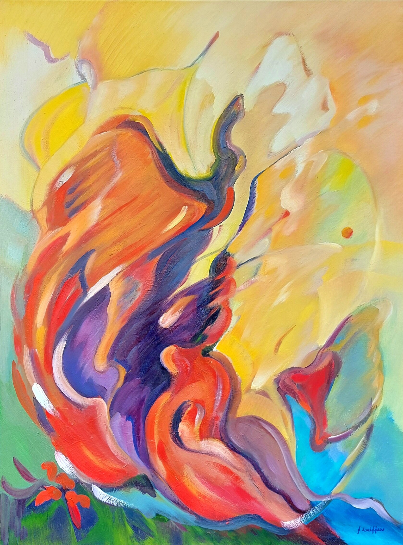 Uit een groene bedding van verlangen rijzen vurige vormen op — een ritmische stroom van kleur, beweging en emotie. In deze dans ontvouwt zich een innerlijke kracht, een transformatie die gloeit van binnenuit.