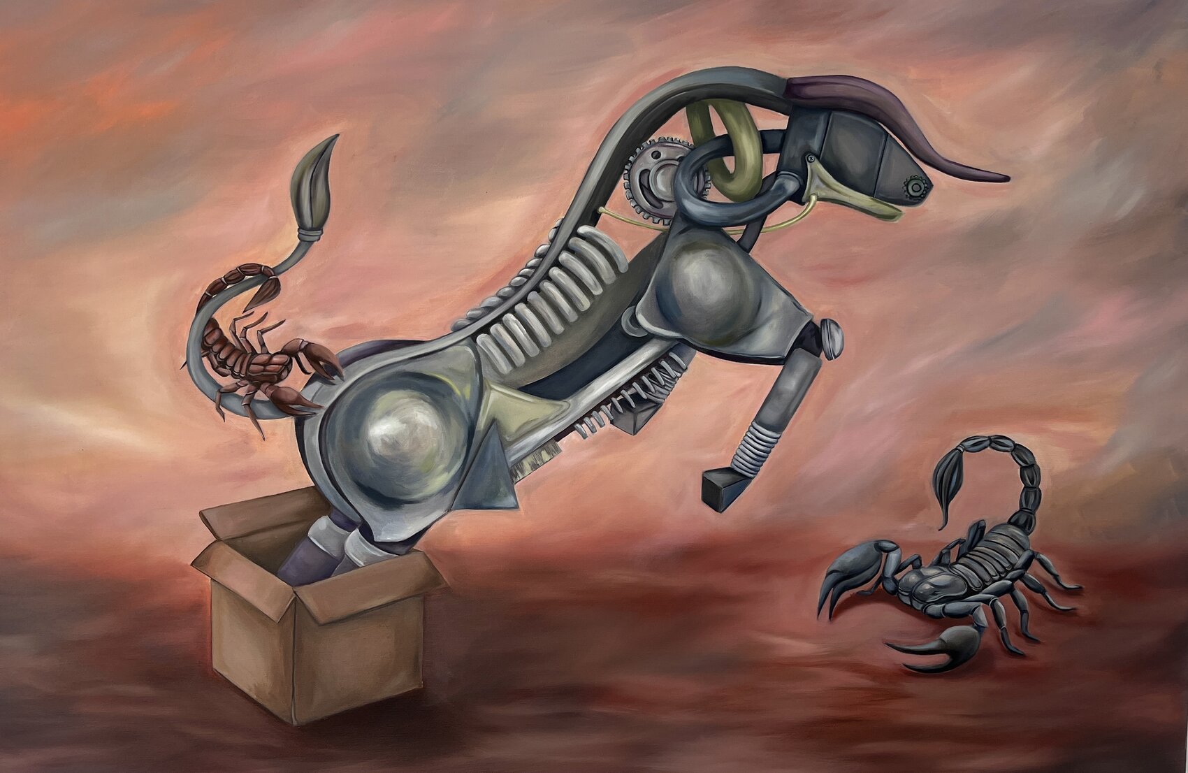 De drie dieren vertegenwoordigen de sterrebeelden van mijn naatse familieleden. Het zou een geschenk zijn om een familie te hebben die in vrede met elkaar kan leven. De stier staat voor mijn grootvader koppig, met een ijzeren wil. De schorpioenen staan voor mijn moeder en tante.