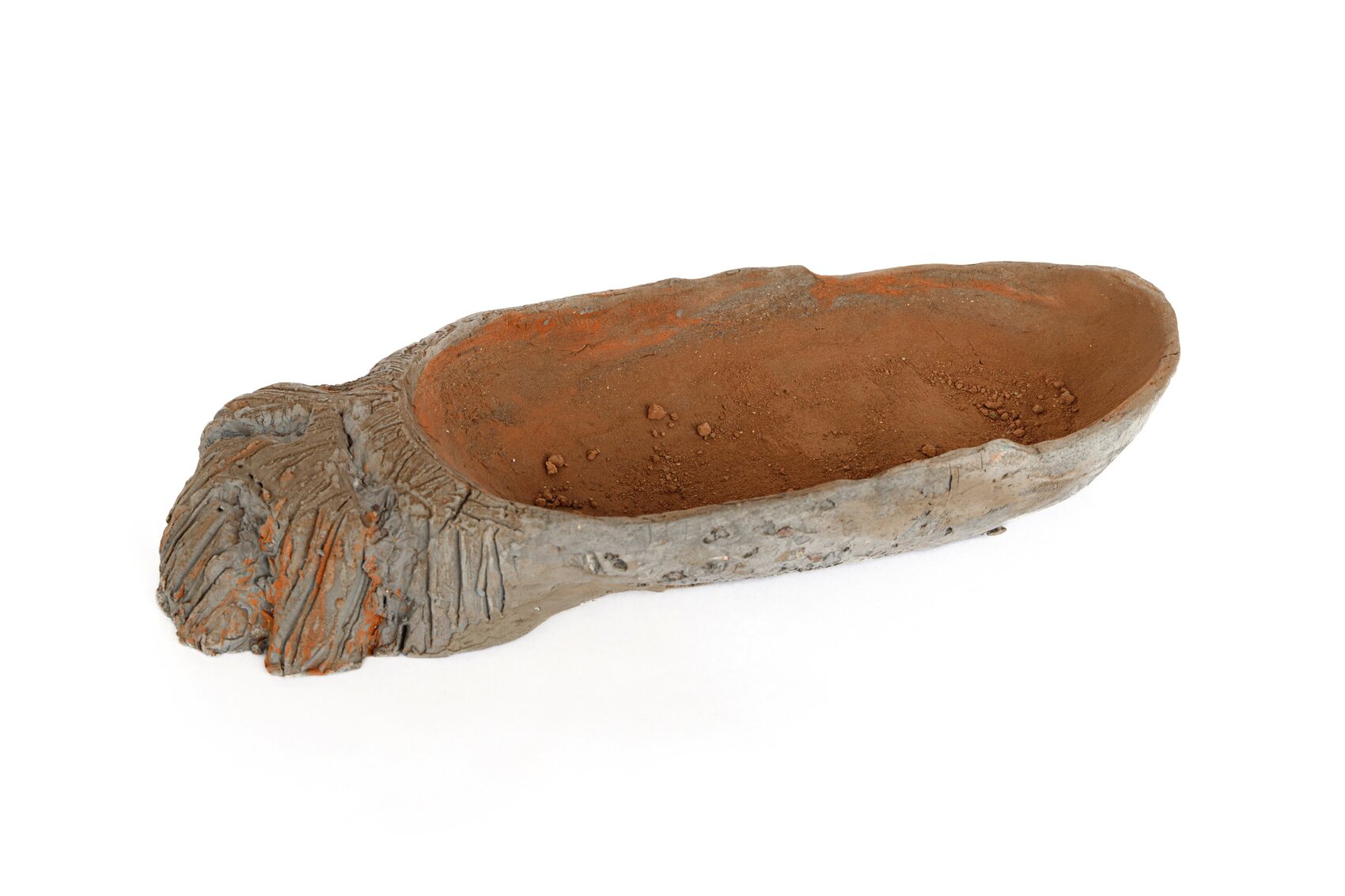 Aan zwarte steengoed klei zijn Boomse aardewerkklei en steenkool toegevoegd. De steenkool werd vooraf in een open vuur gestookt en nadien verbrijzeld. Verwijzend naar de korte steel én in contrast met de lange ‘pan’ werd aan de handgevormde basis een ‘klomp’ klei toegevoegd. De grillig lagen zijn gevormd door kerven, uithalen, invoegen, indrukken en uittrekken. Na een droogstook op 400 °C, volgden een 2de en 3de stook op 960 °C en 1050 °C in een elektrische buitenoven: voor de veiligheid …
