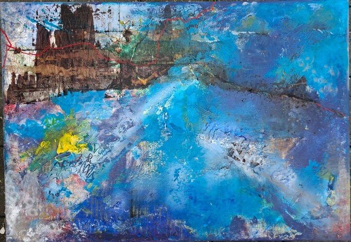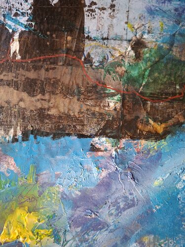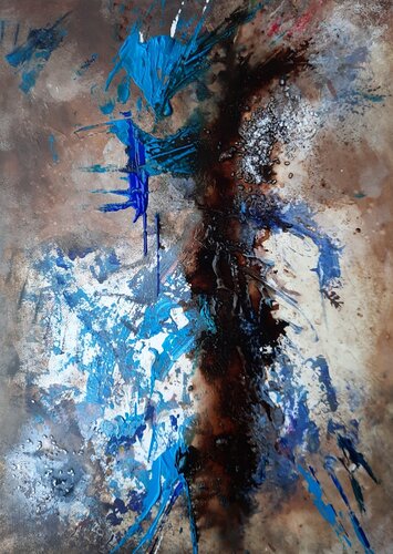 Het werk: "Castel" genoemd, is een abstract werk van 70 x 50 cm op canvas, dat met wat fantasie een dynamisch landschap weer heeft, expressief, met krachtige penseelstreken en spetters die de energie van het afgebeelde onderwerp benadrukken.