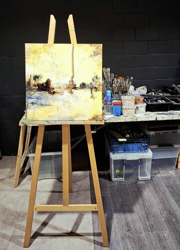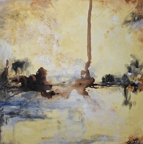 Fade is een abstract werk, die met wat fantasie een landschap met weerspiegelingen voorstelt, gemaakt met gemengde techniek , voornamelijk acryl en notenolie. 50 x 50 op 3D canvas.