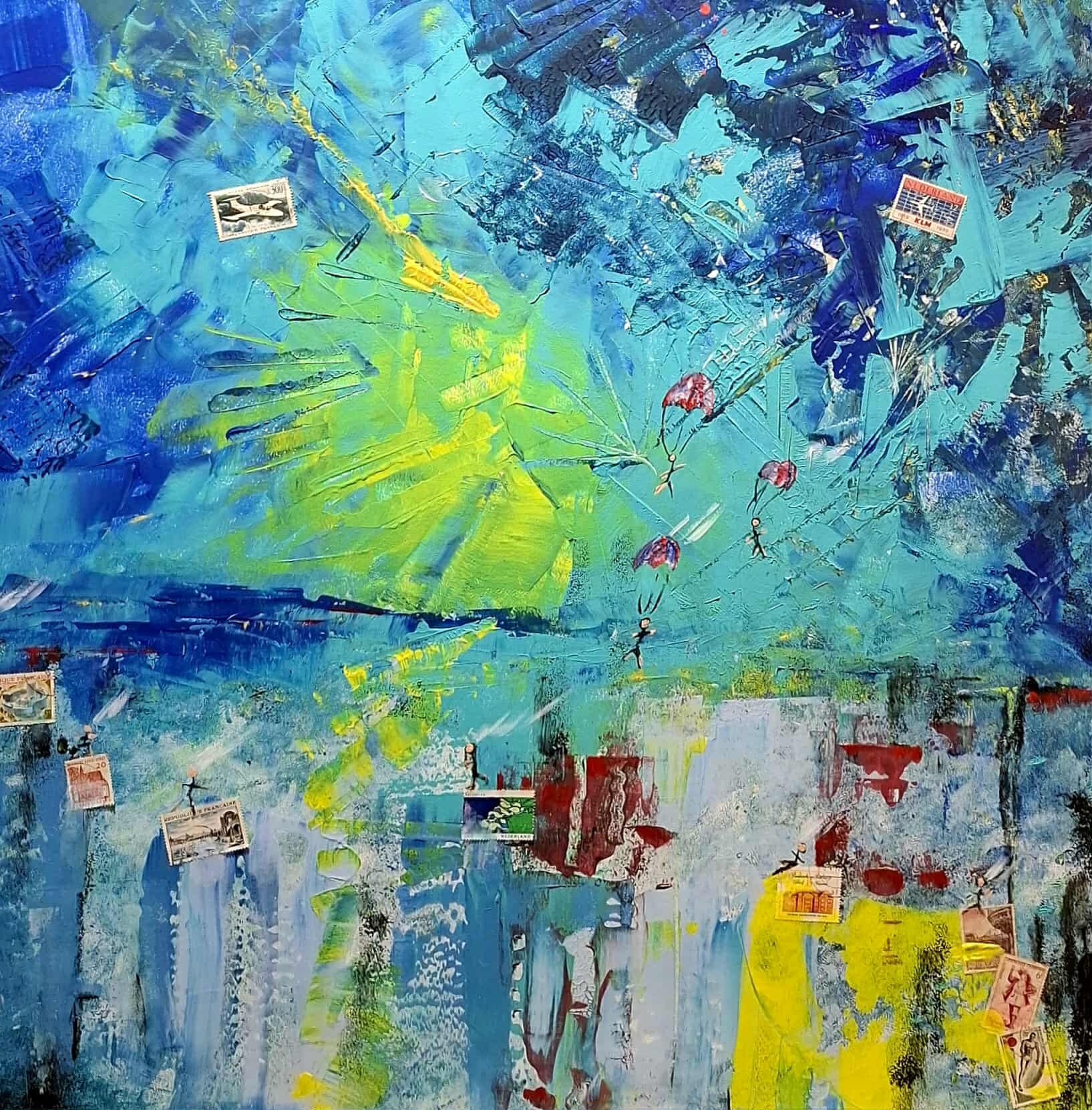 Luchtig werk op MDF: 2 vliegtuigpostzegels droppen verschillende parachute mensjes op de postzegelbestemmingen. Gemengde techniek 60 x 60cm.