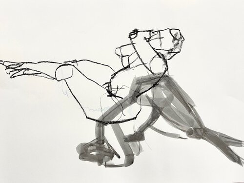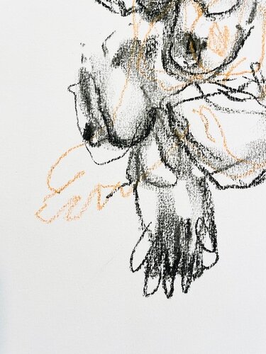 Losse schets in houtskool + blindschets in contrastpotlood (oranje)