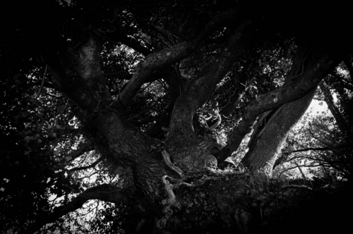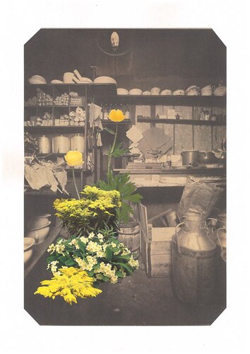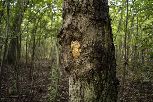 Heleen Sieborgs over Aurum: "Beelden van goudzoekers die goud filteren in de Yukon zijn het vertrekpunt geweest van deze collage. Het idee dat je goud kunt vinden in de natuur vind ik intrigerend. Maar, zonder water geen goud. Pas na jaren concentreert goudstof zich in rivierbeddingen door de stroming van waterlopen. Er kan ook iets gezegd worden over de waarde van water zelf. In sommige tijden en gebieden is dit nog kostbaarder dan goud. In deze collage stel ik een hybride vorm van goud (aurum) en water (aqua) voor met behulp van geoxideerd bladmetaal. Er is veel geweld voor nodig om tot het kostbare te komen; de boom is ontworteld."