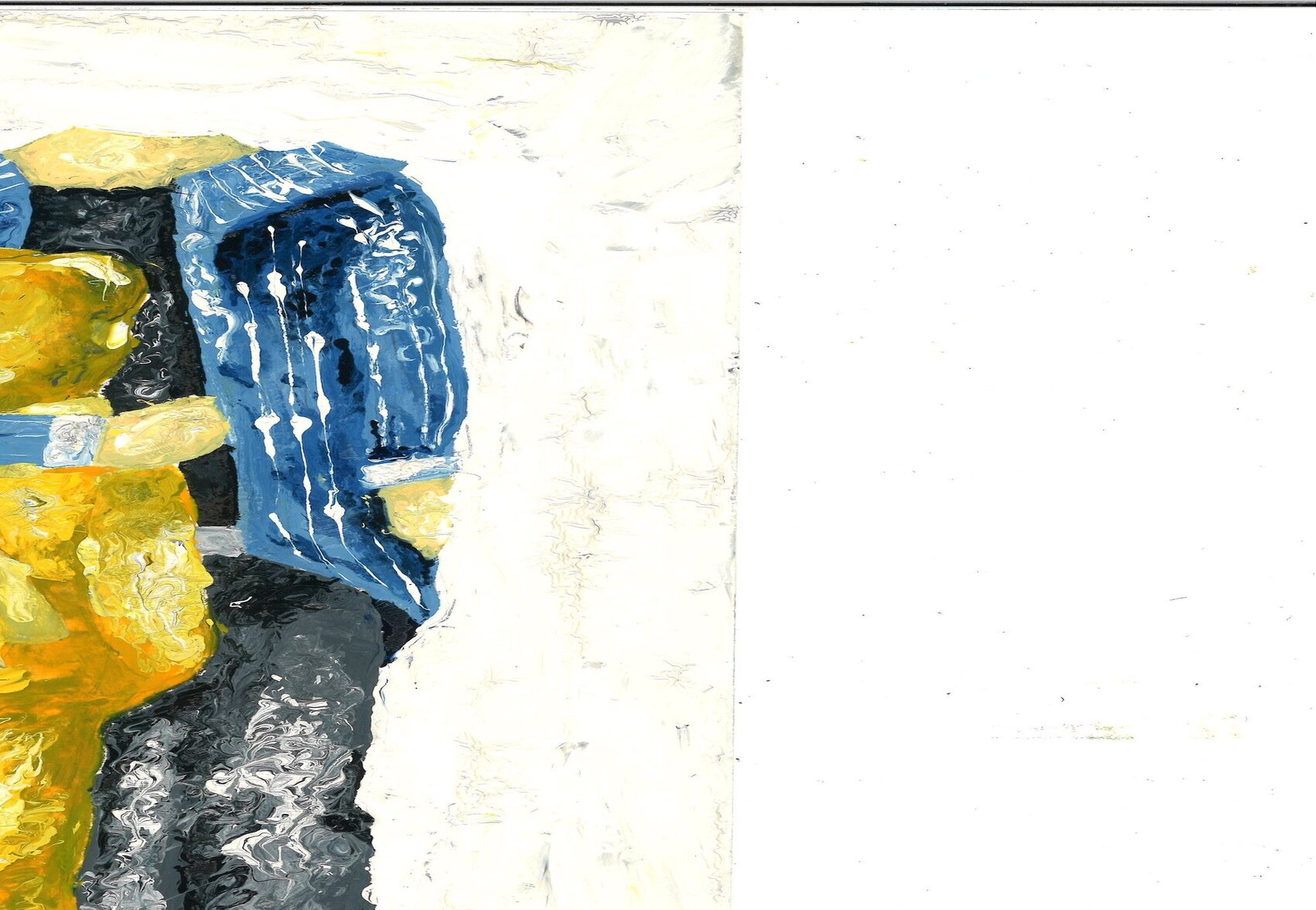 Dit werk is geschilderd met lino-inkt, aangelengd met olie en aangebracht met paletmes op papier. Het vormt een vervolg op mijn eerdere werk Kleine Beer — een beeld dat de monumentaliteit van mijn knuffelberen wilde tonen, maar hun menselijke gelaat bewust achterwege liet. Een spel met identiteit: Wie ben ik? Wie ben jij?